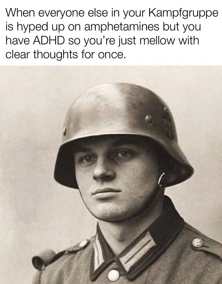 Explanation: The Nazis used high doses of amphetamines and especially methamphetamine to give their soldiers 'staying power' in the field, part of why they overran France - some Nazi tankers were driving and fighting for days straight without sleep or rest. Lower doses of extended release amphetamines are used in the modern day to treat ADHD. One imagines the occasional lone guy with ADHD and a pervitin pill was sitting under a tree and rethinking some life choices instead.